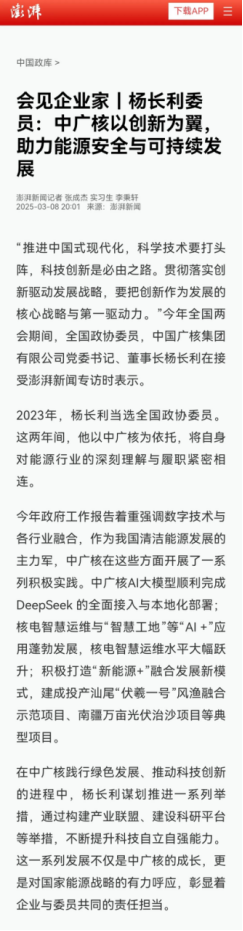 2025年全國兩會期間,全國政協(xié)委員、中國廣核集團有限公司黨委書記、董事長楊長利積極履職盡責(zé),圍繞科技創(chuàng)新、清潔能源融合發(fā)展以及人工智能技術(shù)應(yīng)用落地等熱點問題積極發(fā)聲,人民日報、新華社、中央廣播電視總臺新聞聯(lián)播、科技日報等多家媒體關(guān)注和報道,產(chǎn)生廣泛的社會影響。