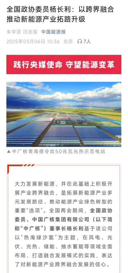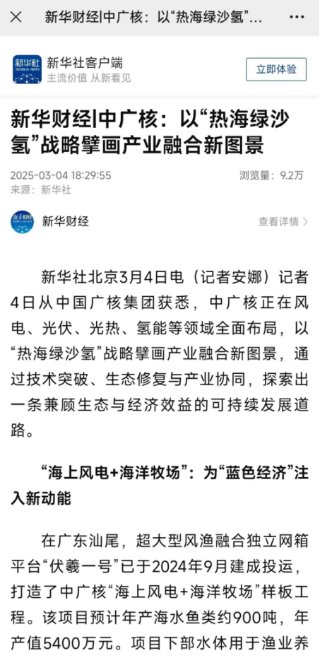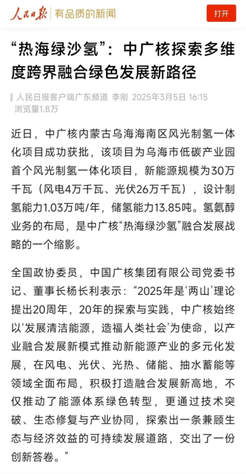 《人民日報》:中廣核正在風(fēng)電、光伏、光熱、氫能等領(lǐng)域全面布局,以“熱海綠沙氫”戰(zhàn)略擘畫產(chǎn)業(yè)融合新圖景,通過技術(shù)突破、生態(tài)修復(fù)與產(chǎn)業(yè)協(xié)同,探索出一條兼顧生態(tài)與經(jīng)濟效益的可持續(xù)發(fā)展道路。