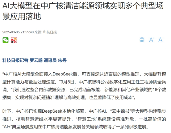 《新華財經(jīng)》:人工智能是今年兩會期間的熱點話題。“中廣核AI大模型已完成DeepSeek的全面接入,實現(xiàn)了DeepSeek模型的本地化部署。同時,一系列核電特種機器人正在核電建造、運維等領(lǐng)域大顯身手。”楊長利說,后續(xù)中廣核將進一步探索人工智能與核電、新能源場景的深度融合,持續(xù)提升生產(chǎn)安全與效率。